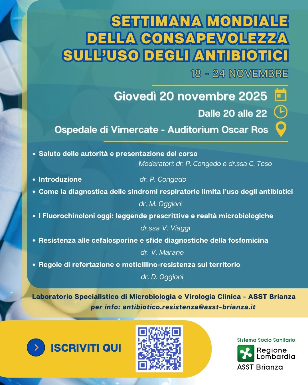 Con la presente informativa, si forniscono le informazioni relative al trattamento dei dati per coloro che effettuano l’iscrizione all'incontro dedicato all'Antibiotico-Resistenza in programma per il 20/11/25 a Vimercate.